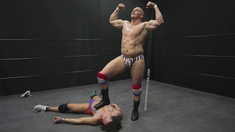 Once they hit the canvas, Roger manhandles him with erotic precision: kicks, stomps, fistfuls of hair, and a punishing goalie kick. He yanks Danny’s singlet straps to make them snap against his skin, then powers him up for a power slam that rattles the ring. Danny’s body twists under a deep sharpshooter, and Roger grinds his knee straight into Mercury’s groin — slow, deliberate, dominating.