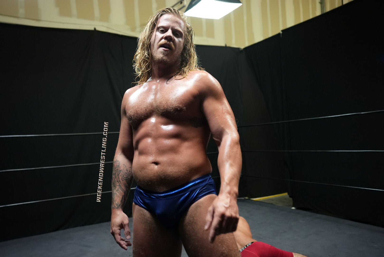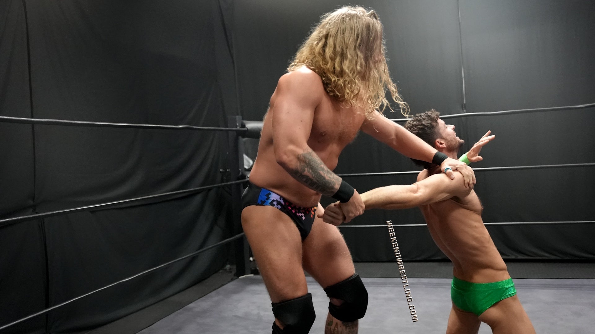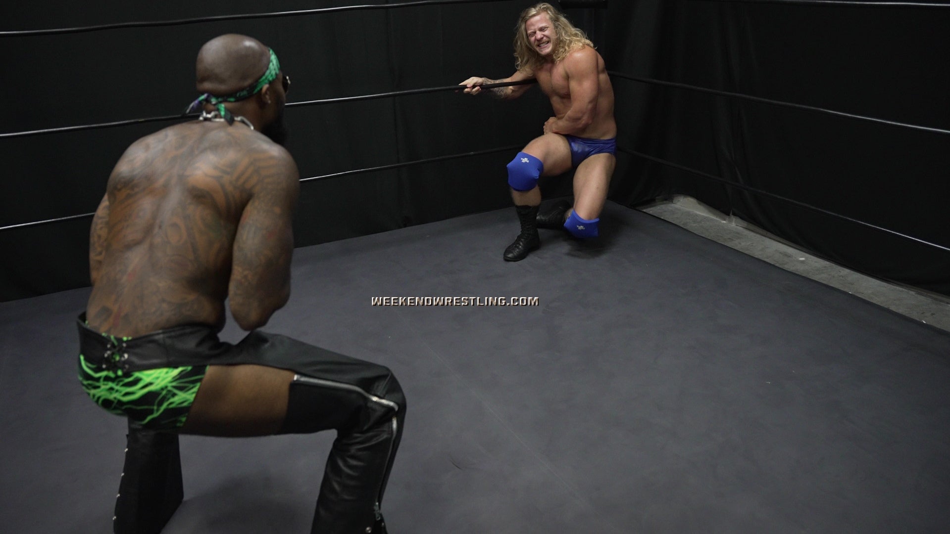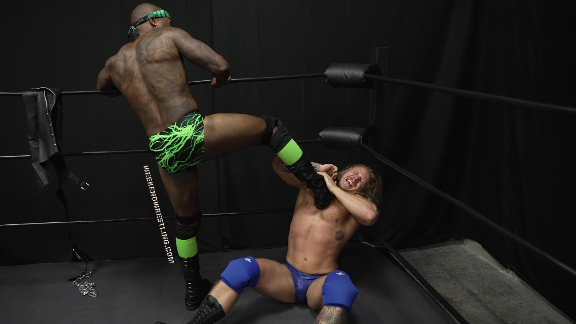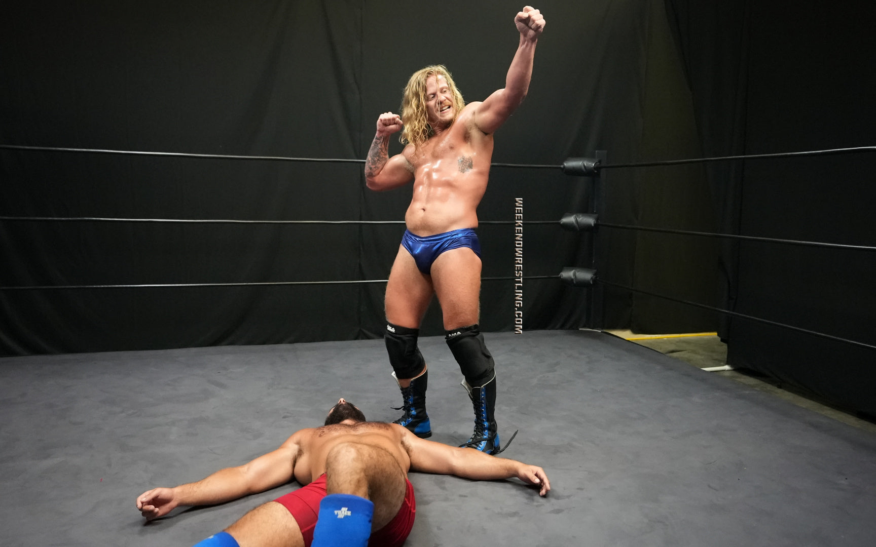 I always love a good Big vs Small match. Ricky Vegas manhandles Stefan and it's so hot. He low blows him, forces him to flex, and knocks him out. Stefan looks hot in the spandex gear and love that he sells the low blows so well clutching his battered bulge throughout the match.