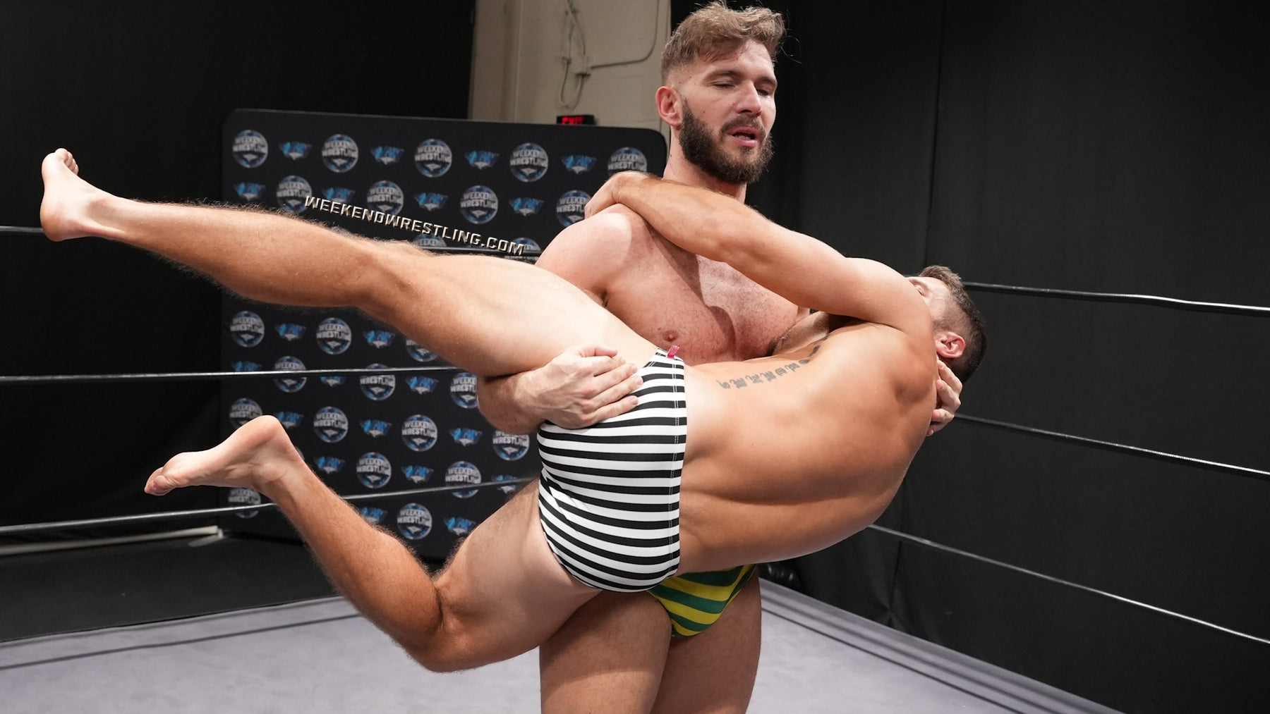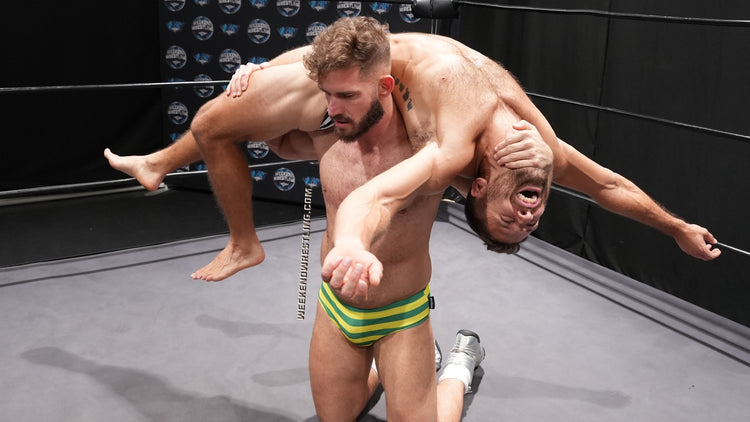 Weekend Wrestling drops you straight into a sweaty, body-forward singles fight as Blayne is already in the ring in black-and-white striped briefs, barefoot and pacing, talking to himself about who might be next. Then Stefan Stone literally lands in frame in yellow-and-green striped briefs, white socks, and athletic shoes, and the answer comes fast. The size difference is obvious the instant they lock up, but so is Blayne’s strength. He gets the jump on the bigger man with a lift that bends Stefan over his shoulder, puts those heavy glutes on display, and adds a playful smack that tells you exactly what kind of match this is going to be: competitive, humiliating, and full of one-upmanship. The banter never lets up, and neither does the need each man has to prove he can dominate the other—especially with Blayne’s bare feet in full view for fans who know exactly why that little detail matters.