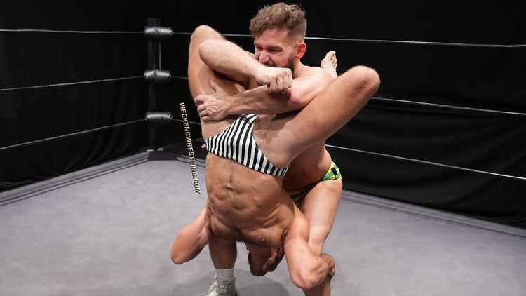What follows over more than 25 minutes is a tight-briefs war of control, punishment, and display. These two trade shoulder blocks in the corner, sleeper holds, camel clutches, hammer locks, body scissors, Boston crabs, bow-and-arrow pressure, figure-fours, abdominal stretches, full nelsons, torture racks, over-the-knee backbreakers, Gory specials, and a modified tarantula, constantly forcing each other into arched, spread, or suspended positions that make the struggle look as erotic as it feels brutal. There are multiple fireman’s carries, a tree of woe, leg-splitting spladle, leg drops, an atomic knee drop, a package piledriver, purple nurples, and dirty shots when either man wants to make the humiliation sting harder. Stefan and Blayne both love showing off when they’re on top, flexing over the other with that smug little pause that says look who’s in charge now, and Blayne’s exposed toes become their own target when the punishment turns to toe torture. It’s a match built for fans who want muscular hunks in briefs testing strength, carrying and stretching each other, and fighting through pain, embarrassment, and pride until one man simply cannot continue.