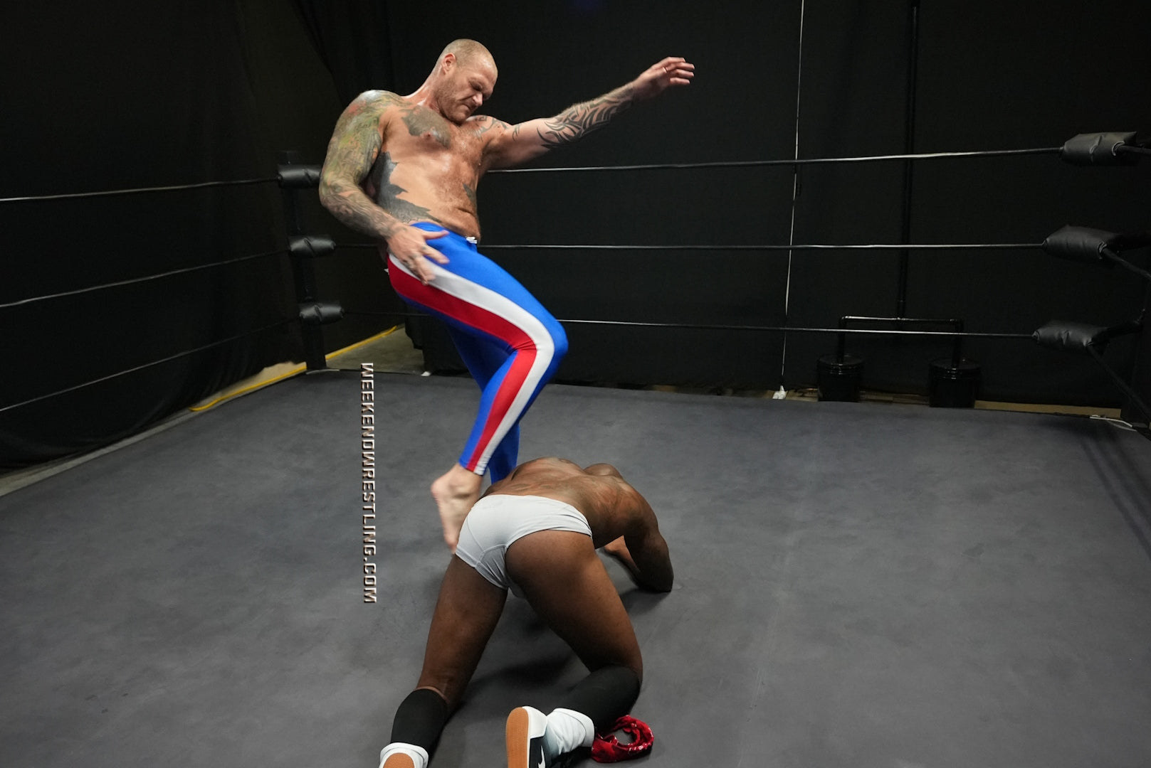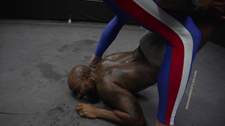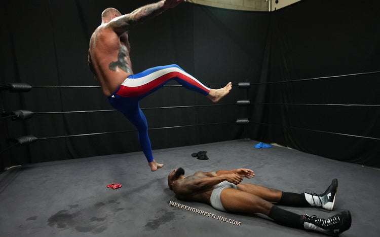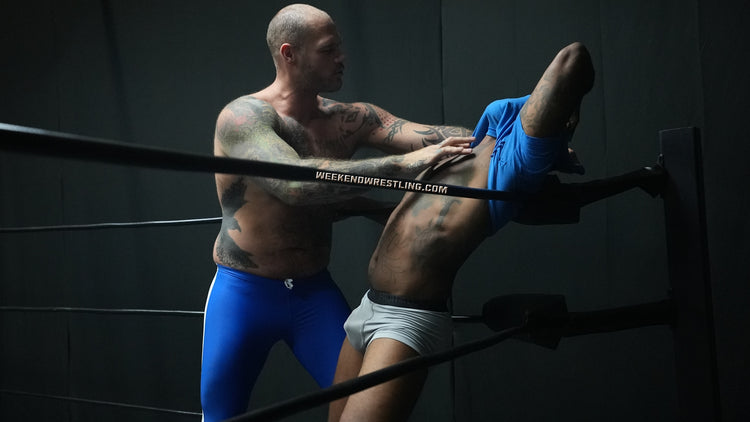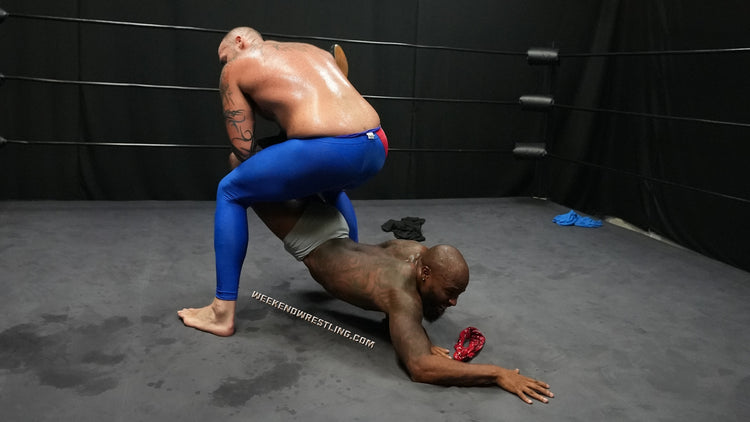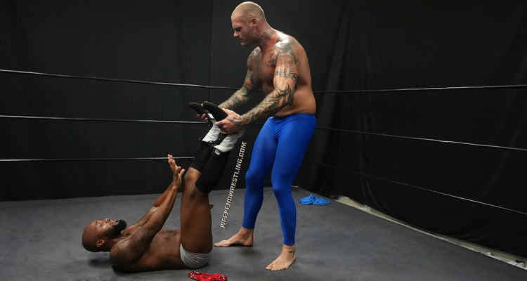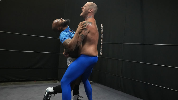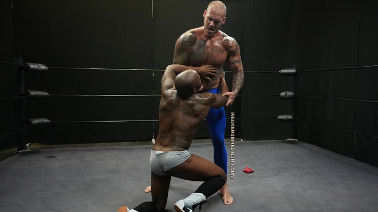 In a colossal clash, the giant VanGore (7'0", 305 lbs) faces off against the smaller but spirited Dallas Washington (5'9", 190 lbs). Attempting an unusual approach, Dallas tries to teach the giant to dance, but frustration takes over, leading to a brutal turn of events. Dallas becomes the target of VanGore's overwhelming strength, enduring palpable pain as he's manhandled, punished from ring posts to canvas and stripped to his tighty whities. Despite valiant attempts to rally, Dallas is repeatedly halted and worked over by the dominating giant, creating a match where the struggle between size and resilience unfolds in the unforgiving arena.
