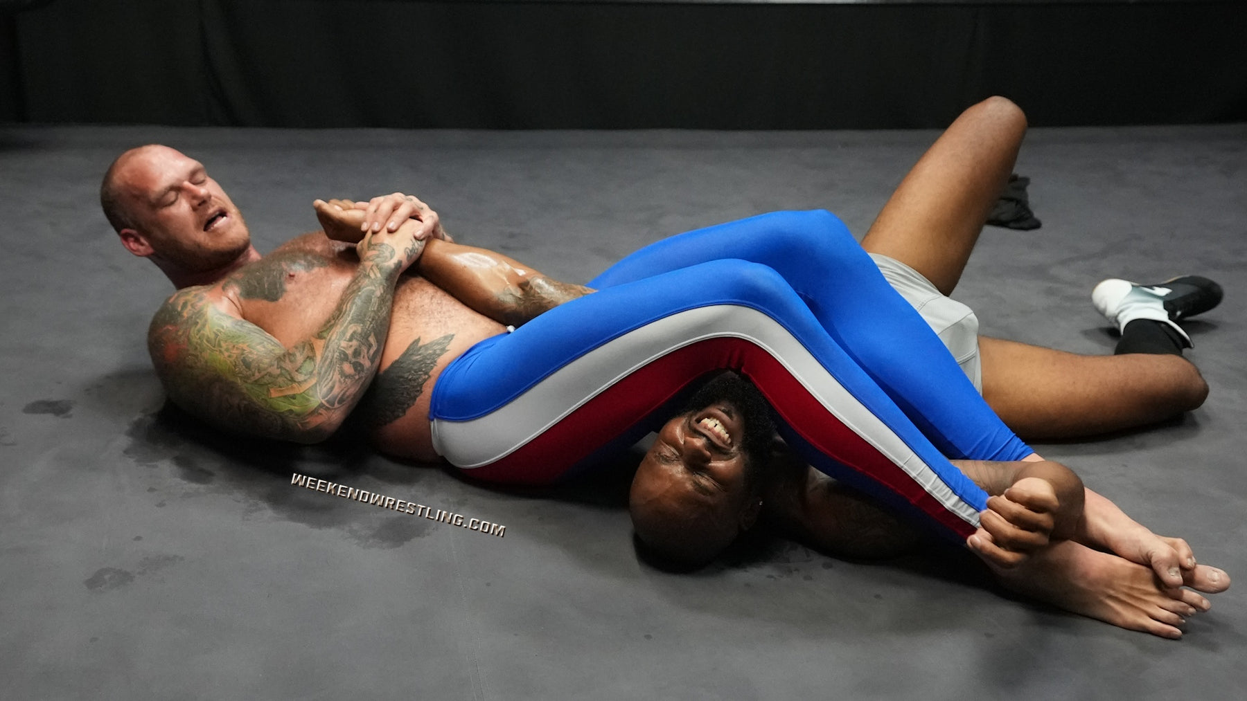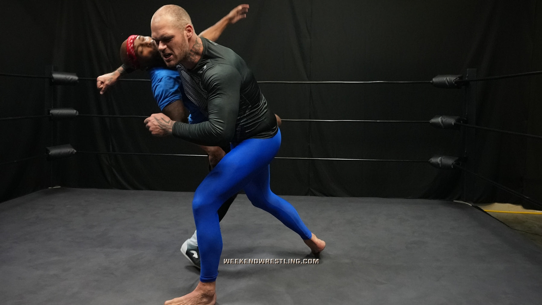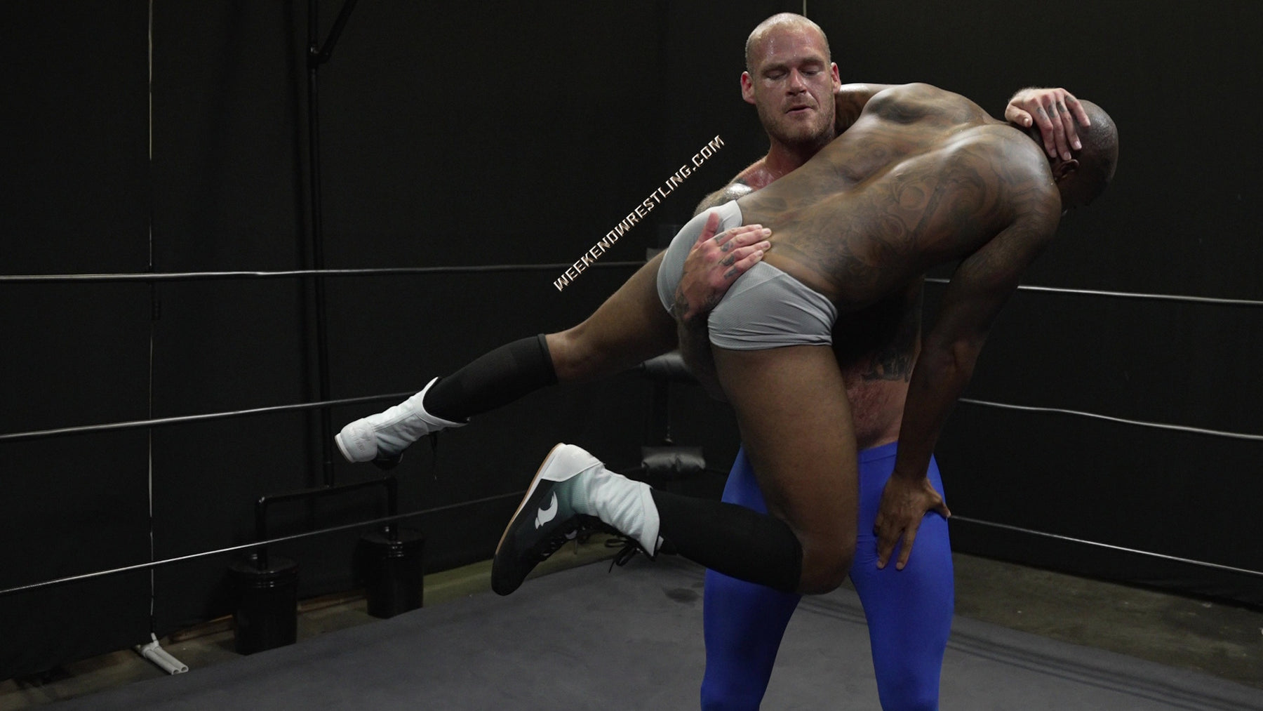 In a colossal clash, the giant VanGore (7'0", 305 lbs) faces off against the smaller but spirited Dallas Washington (5'9", 190 lbs). Attempting an unusual approach, Dallas tries to teach the giant to dance, but frustration takes over, leading to a brutal turn of events. Dallas becomes the target of VanGore's overwhelming strength, enduring palpable pain as he's manhandled, punished from ring posts to canvas and stripped to his tighty whities. Despite valiant attempts to rally, Dallas is repeatedly halted and worked over by the dominating giant, creating a match where the struggle between size and resilience unfolds in the unforgiving arena.