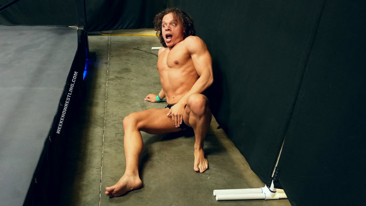 In preparation for his match with big Mo Manson, muscle-boy, jokester Danny Mercury brought his magic freeze-frame hat in the hopes that it might give him enough of an advantage to edge out a win. The size difference between these Weekend Wrestling Stars makes it easy to see why anyone might resort to such measures. Danny's tactics of playing jokes might be successful on some wrestlers, but Mo LOVES to play (with young hunky men) and Danny's well-proportioned musclebound body is perfect. Now, if he could only see what party favors Danny is hiding underneath all that wrestling gear ...