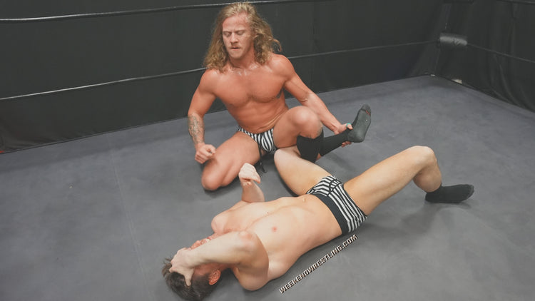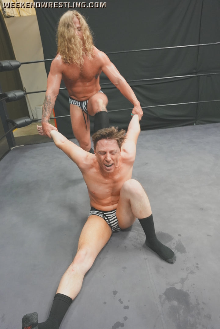 What feels like this match is going to be playful, it quickly escalates into a heated back-and-forth with everything from abdominal stretches to toe torture. Stefan and Blayne are fairly evenly matched physique- and skill-wise. Stefan is slightly taller and thicker than Blayne, but that doesn't stop Blayne from going all out. Who the winner will be is really up to the final moments of the match. Blayne's vertical-striped black-and-white trunks are almost as hot as Stefan's horizontal-striped green-and-yellow briefs. Both wrestlers look incredible. Great match!