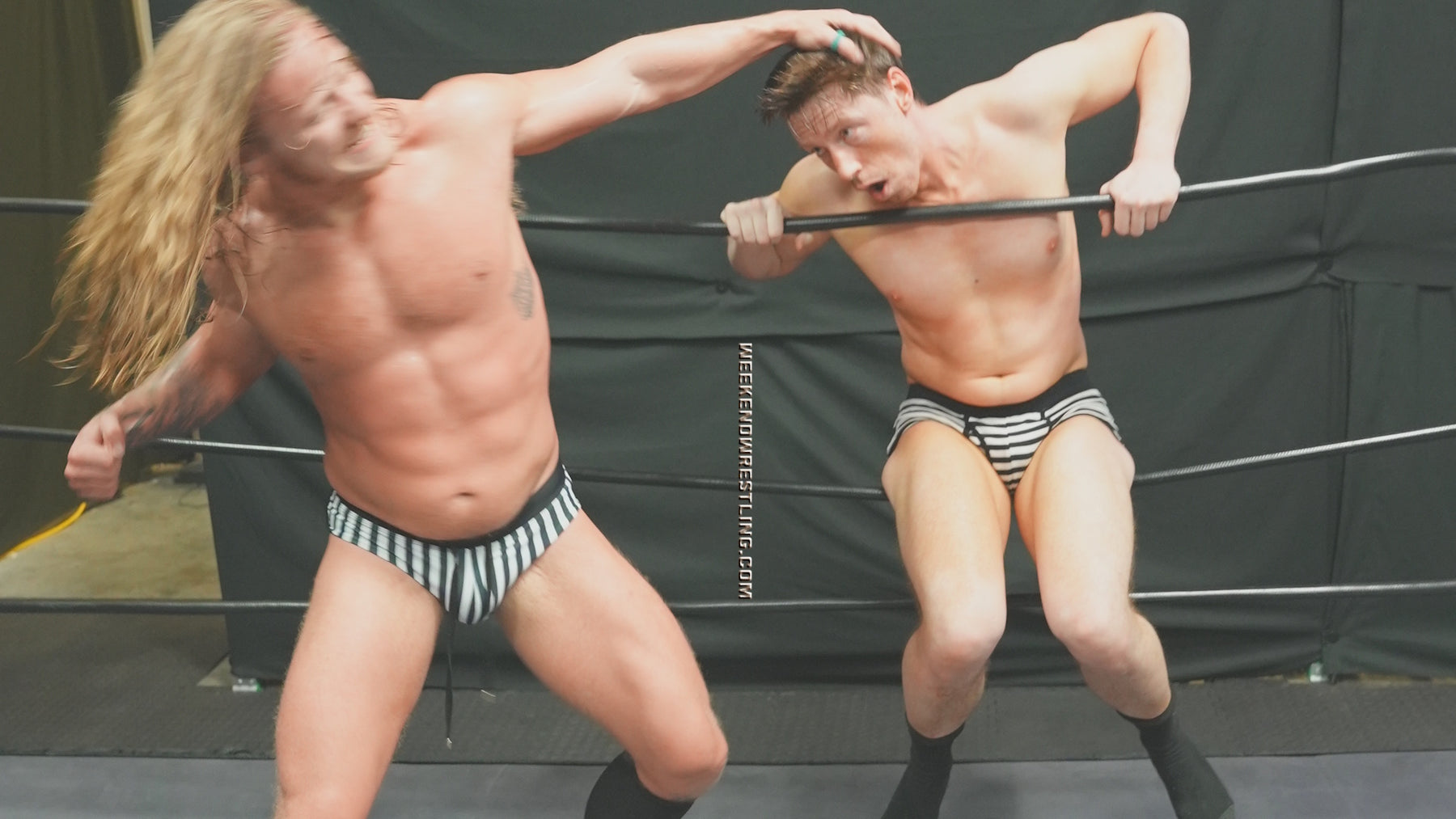 Weekend Wrestling opens on what’s either a scheduling hiccup or the kind of “accident” that feels way too perfect: Jason Aleqsander and Tanner Ripley are ready to square up, and then—out of nowhere—Jack Dillon and Ernie Lofton end up chest-to-chest in matching ref shirts, both doing their checks like they’re the only authority in the building. The unspoken question hangs in the air for about two seconds: who’s the real ref and who’s in charge? Then it turns into an argument, Aleqsander and Ripley quietly decide they’ve seen enough “officiating,” and they slip away while the striped warriors choose to settle their little jurisdiction dispute the old-fashioned way. Shirts come off, it’s down to striped ref underpants and socks, and suddenly the ring belongs to two hunks with equal parts ego and bad intentions—close cameras, exposed skin, and a grudge that’s way too personal for anyone to pretend it’s “professional.”