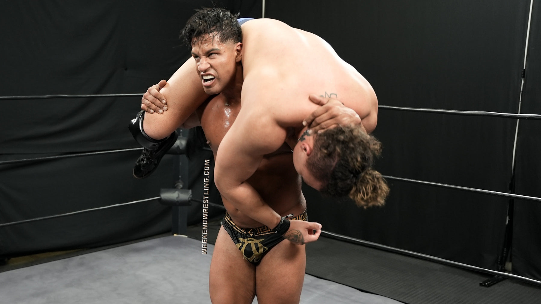 The scene opens with Adam Astora, the newest muscle-stacked stud at Weekend Wrestling, sprawled in the ring, using a massage gun to soothe some nagging back pain. The poor rookie can’t quite reach the tight spots, so in saunters Gabe Steel—a seasoned pro with an eye for opportunity and a history of making muscleboys suffer. Ever the “helpful” gentleman, Gabe offers a hand, but that hand quickly turns cruel. With a grin that says he knows exactly what he’s doing, Gabe digs the massage gun in a little too deep, a little too rough, until Adam’s body jerks in distress. The big, overconfident soccer stud realizes too late that he’s just walked into a trap.