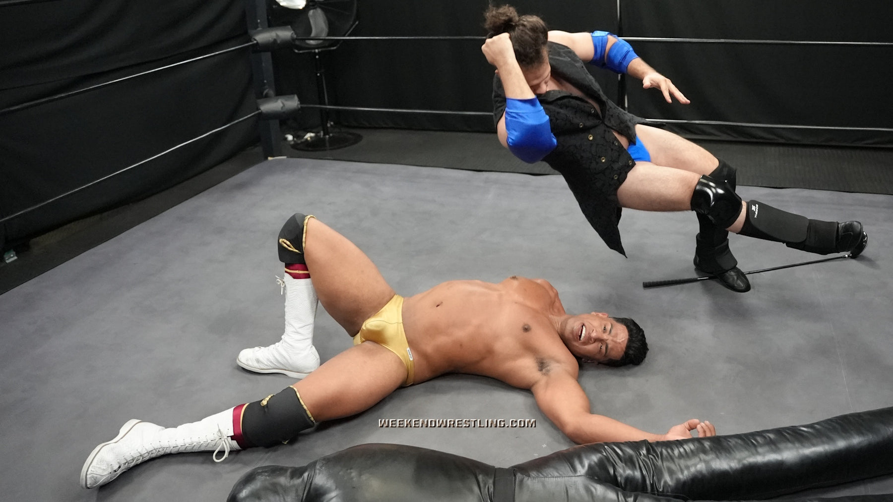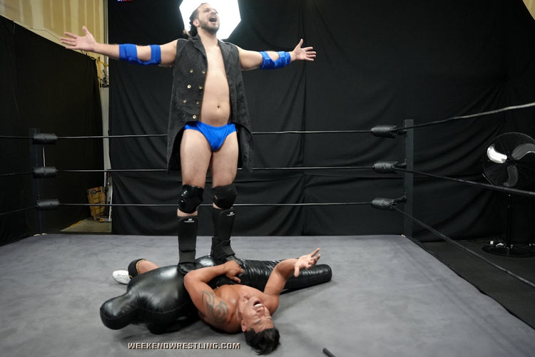 But Gabe isn’t all talk and style—he’s steel for a reason. He claws back with a brutal low blow, flips Rico into a dragon sleeper, and returns the favor with savage golf club shots—one crushing straight to Rico’s manhood. Torture racks, scorpion locks, bow-and-arrows, and knee drops keep Rico displayed and begging “Juan” for backup, only for the dummy to come alive with Rico’s help. Before a twisted finale, Gabe is pinned beneath Juan’s weight, scissored, and leg-dropped again and again, forced to endure the double-team humiliation as Rico grinds his hips and mocks him into complete humiliation.