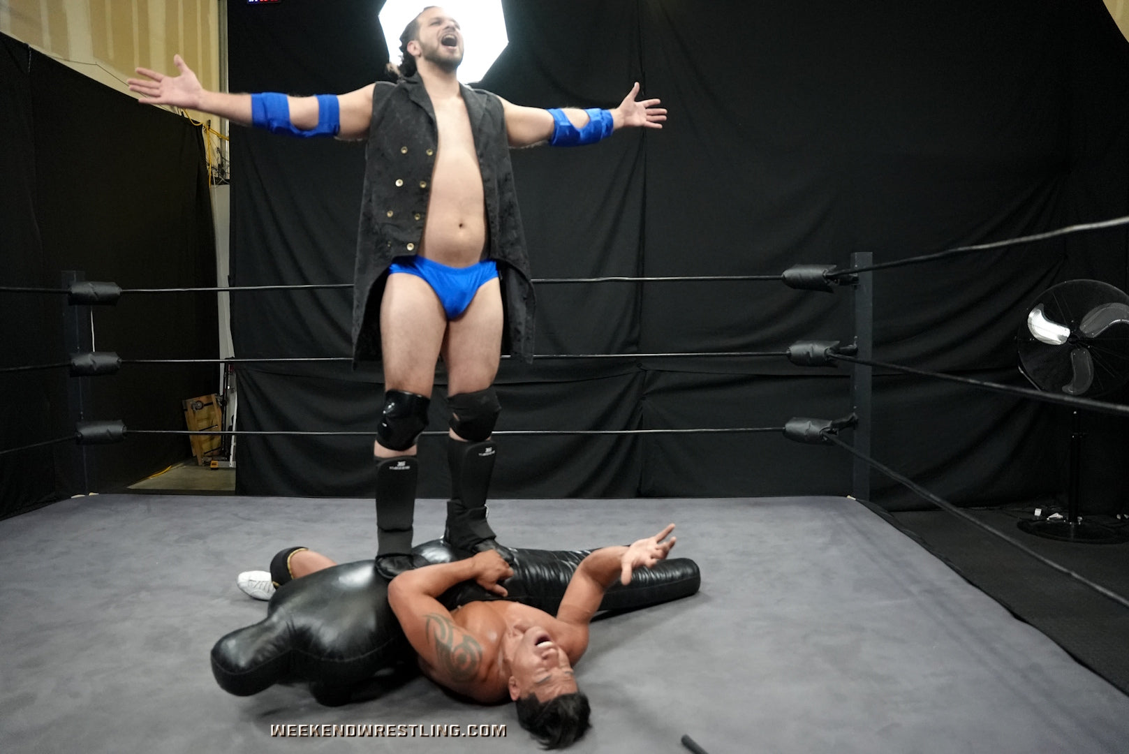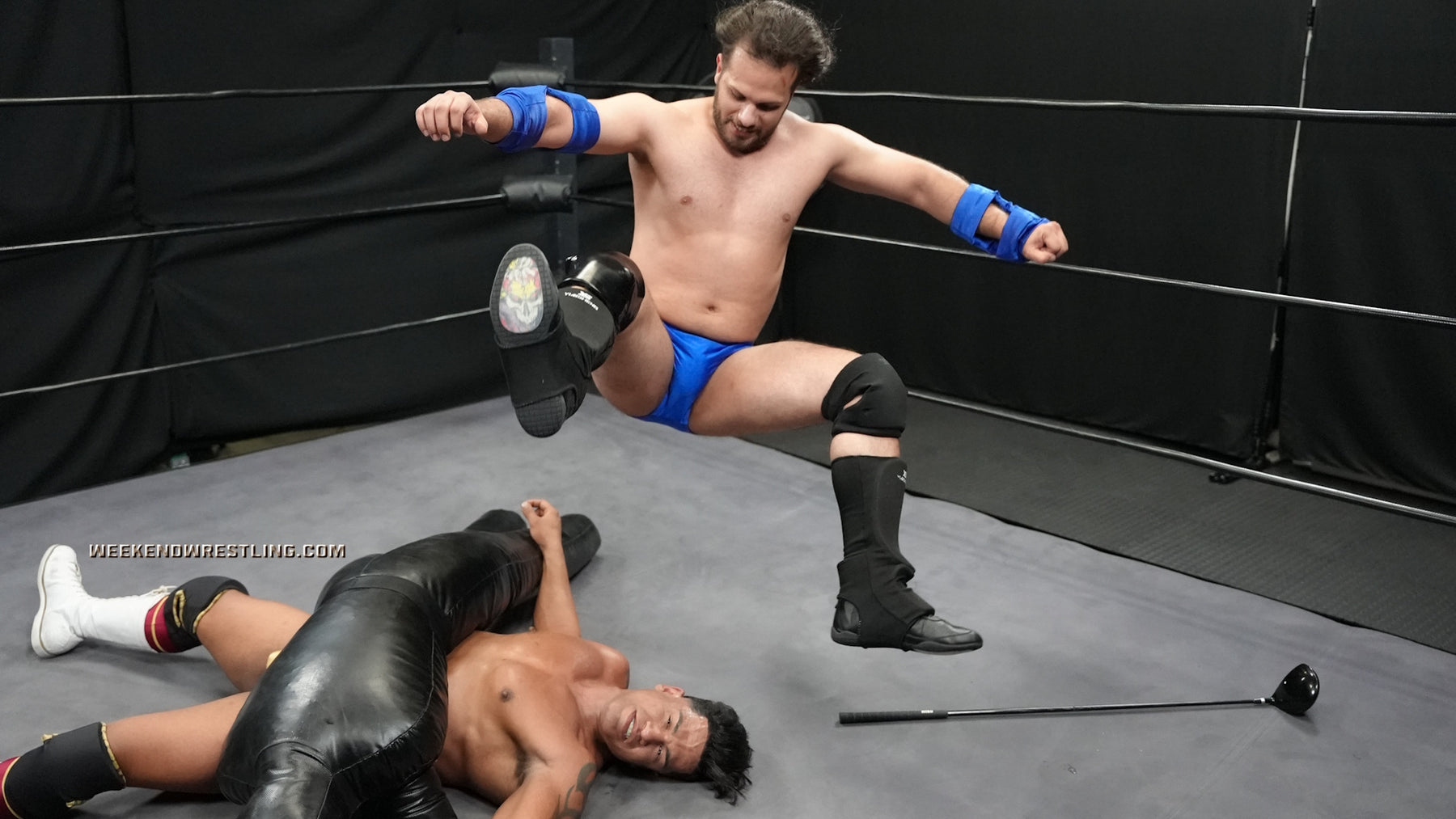 Gabe Steel opens the ring session like a man on a mission, drilling holds and finishers on “Juan,” the Weekend Wrestling training dummy. But this isn’t practice—it’s punishment. piledrivers, racks, and submissions—Gabe seems to be working out his fantasies of domination on the lifeless figure. What he doesn’t count on is what happens when the dummy fights back. Enter Rico Romero, long hair flowing and hips gyrating, creeping in with a golf club that cracks across Gabe’s broad back, then digs deep into his neck.