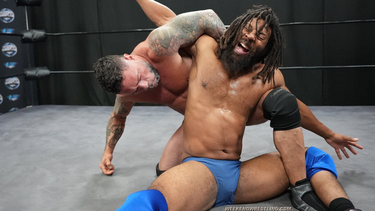 Sadistic Sid Shaw sprawls on the WW office futon in red trunks and a sleeveless hoodie, muttering through a “therapy” monologue about never being properly touched—right up until his “therapist” storms in: Jag, pink shirt stretched across his chest, blue trunks and pads hugged tight. Credentials questioned, Jag supplies hands-on treatment—dragging Sid to the ring, peeling off his own shirt, and looping it around Sid’s throat. For 26 breathy minutes, Jag “touches” at will: a grinding camel clutch that pulls a wicked smile from Sid—“this is what I needed”—before the Sadistic one answers with a bite. A sharp back-elbow flips control; Jag crumples in the corner while Sid plants a boot on his manhood, then crowns it with a head-butt. The comeback is instant and nasty: Jag knots Sid into a single-leg Boston crab, cameras drinking in every flex and flare, then rains down good old-fashioned ab punching that leaves Shaw heaving.