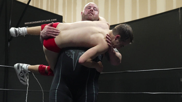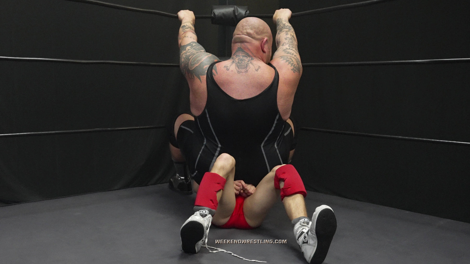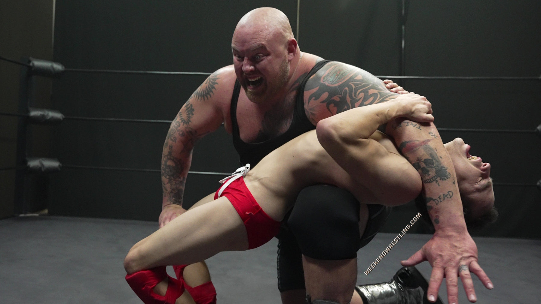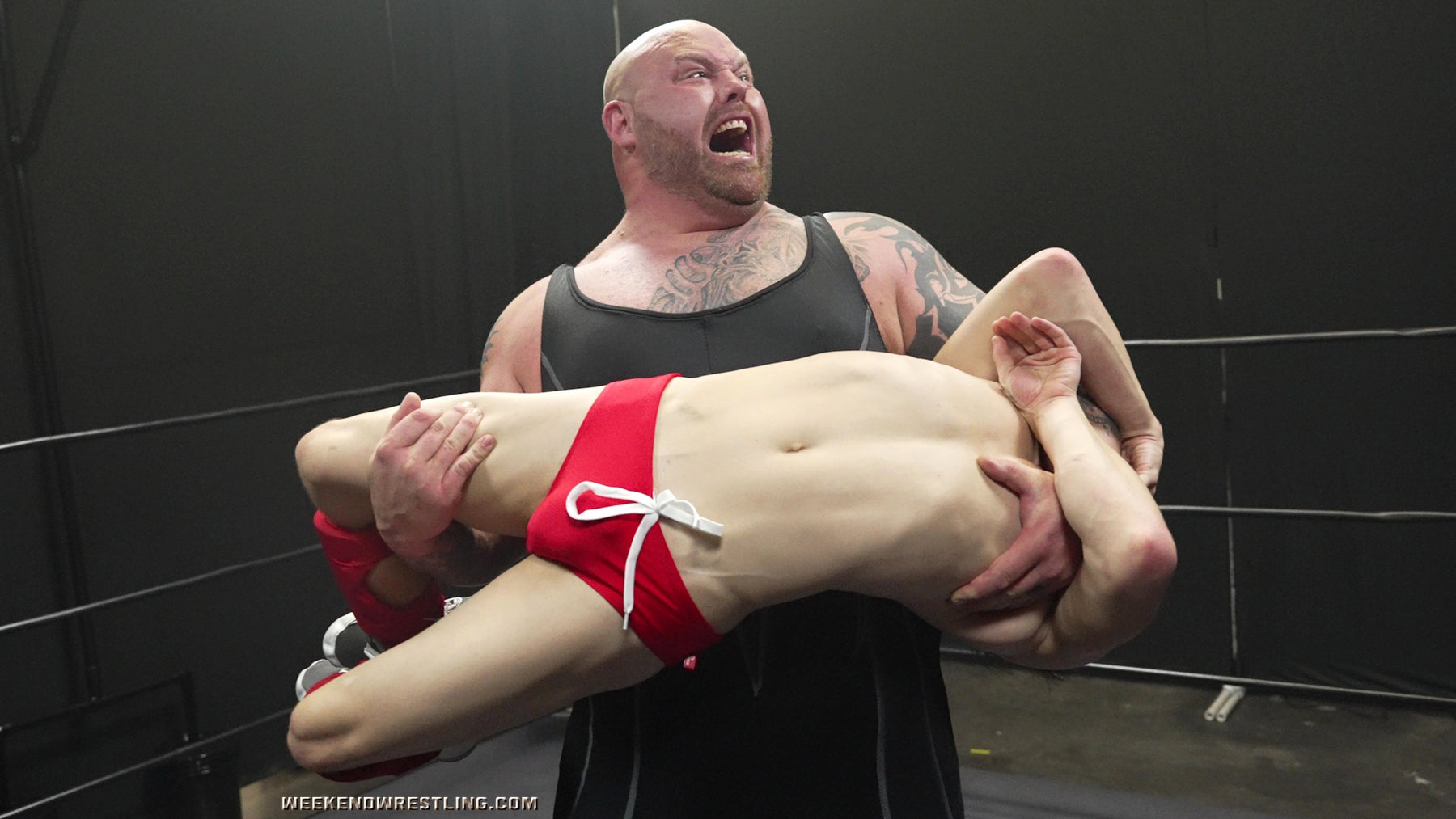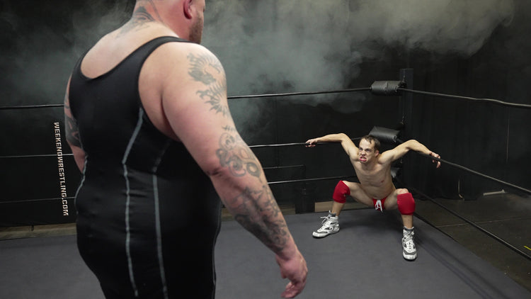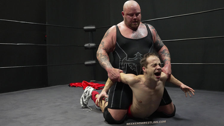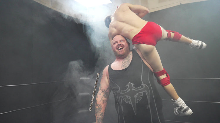 Weekend Wrestling serves up a size-mismatch spectacle as Joey McCoy—one of the smallest on the roster—slithers into the ring in bright red trunks, red knee pads, a red cloak he ditches almost immediately, and white athletic shoes… and then looks like he’s wandered into the wrong nightmare when his eyes meet Shockwave, in his signature XXXXXL black-and-gray singlet with black knee pads and silver/black boots. Joey may carry that demonic-darkness swagger, but the contrast is insane: Shockwave isn’t just bigger—he’s inhuman next to him, making Joey look almost child-sized until the bell turns it brutally clear that Joey is all man (maybe even superhuman), because he keeps taking the kind of punishment that would fold most wrestlers. Joey explodes early with strikes and a running forearm, fighting for any opening he can find, but the giant absorbs it, shrugs it off, and decides this is going to be 23 minutes of stretching, rag-dolling, and humiliating display.