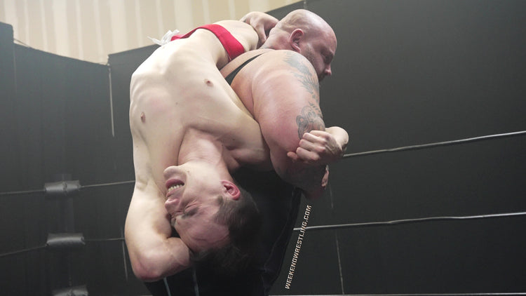 From there it’s one-sided in the way domination fans crave—Shockwave manhandling Joey into positions that show off just how flexible the “little demon” is, grinding him down with crushing boots that pin him to the canvas, shoulder blocks that bounce him like a toy, and nasty trunk yanking wedgies that turn Joey’s gear into a handle. Joey gets hoisted high by the neck and the trunks, folded and arched in a modified torture rack, dragged into punishing crabs, smashed under a Banzai drop, and swallowed up in a bearhug with a full handful of red fabric as Shockwave squeezes the fight out of him. The humiliation gets meaner: Joey’s shoes get tied together, he’s lifted and racked and bent backward over Shockwave’s torso, dumped across a vicious knee backbreaker and kept arched there while he’s punished, choked over the middle rope, flattened by thunderous drops, and even stuffed into a double-leg pin that jacks his muscular glutes high while his knees crowd his own chin—Joey barking “I’ve got you right where I want you” like sheer attitude can save him. Shockwave tops it off by swaddling Joey in his own discarded cloak and carrying him around the ring like a trophy-baby, a malicious giant making it clear this isn’t about winning a contest—it’s about sexy destruction and total control… with the twisted finish left for you to discover.