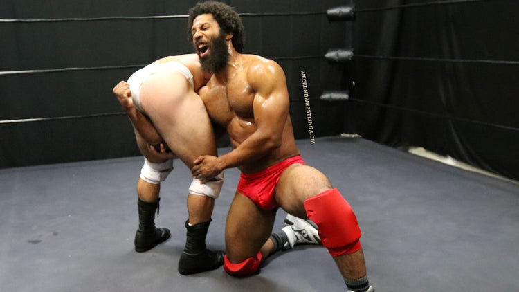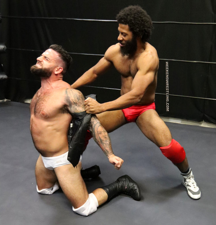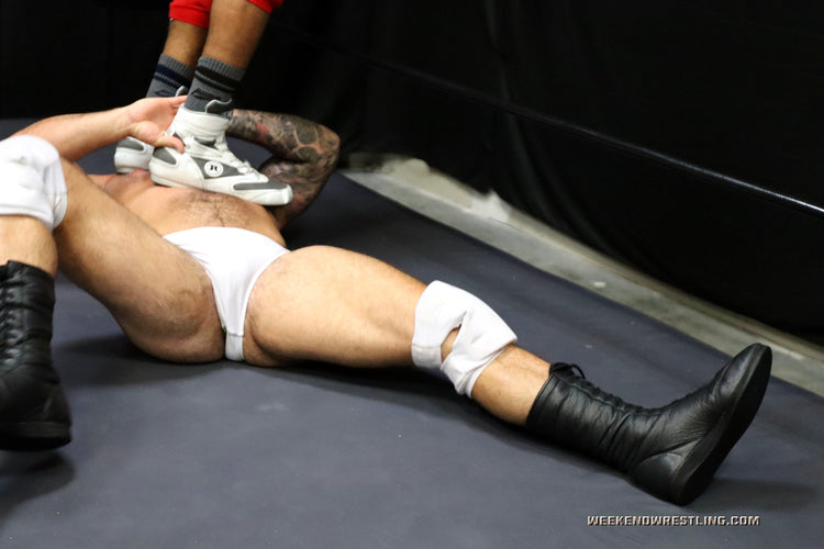 When others go high, Jag goes low and Johnny Greco never even saw it coming. Not the first one, nor anyone after that. But that's not the only trick Jag has. A handful and yank of Johnny's trunks, a well placed claw hold, some targeted stomps landing in some very sensitive areas all tenderize the hunky Sicilian. Shredded stud Jag sinks them in deep, long and slow, setting his young prey up for an excruciating finisher.