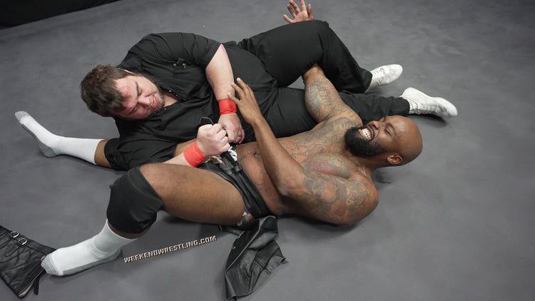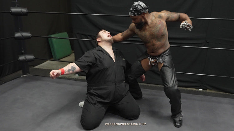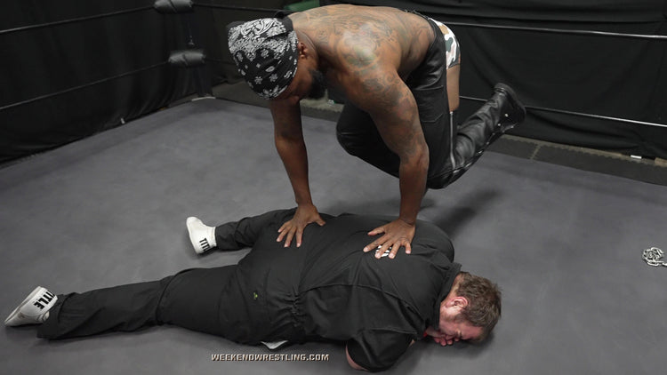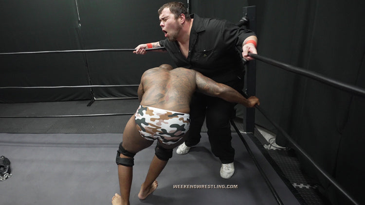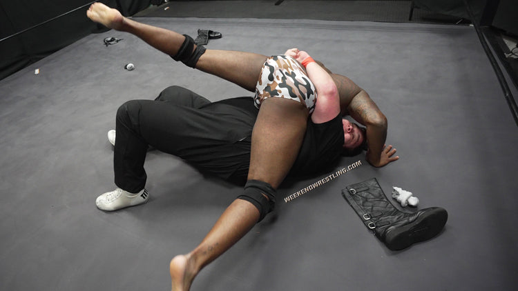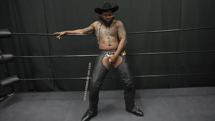 Mo, pissed, still aroused and completely undeterred, retaliates with deep gut shots and meaty claws that make Dallas double over and moan. From there, the slow stripping begins—those chaps, peeled away; those boots, yanked and used to spank that juicy, abundant ass. Dallas gets stretched, bent, punished and humiliated as Mo tears into him with full sadistic delight. A desperate low blow gives the dancer one more shot, and he nearly takes the big man down with a savage single-leg crab. But Mo doesn’t stay down. He rises, eyes locked on the last bit of fabric clinging to Dallas’ body. A brutal, sensual display of domination that ends exactly how Mo likes it.