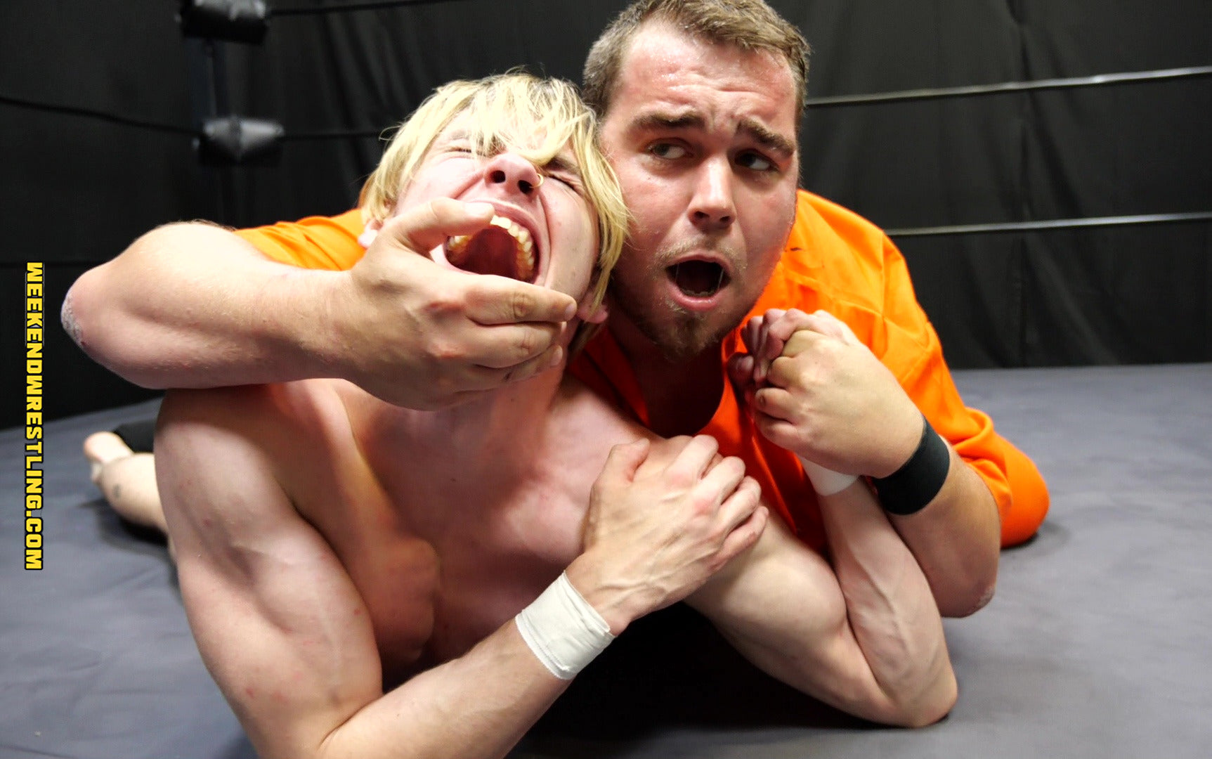 Our arranged meeting between these debuting stars results in a prison strip match where it's David vs Goliath and anything goes. Young Tristan discovers the definition of humiliation as he is slowly stripped and tortured by the much bigger Mo and this is only the debut for both of them here at Weekend Wrestling.