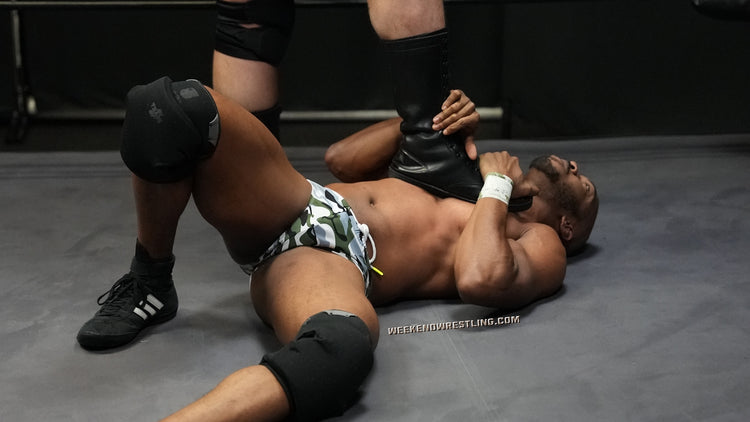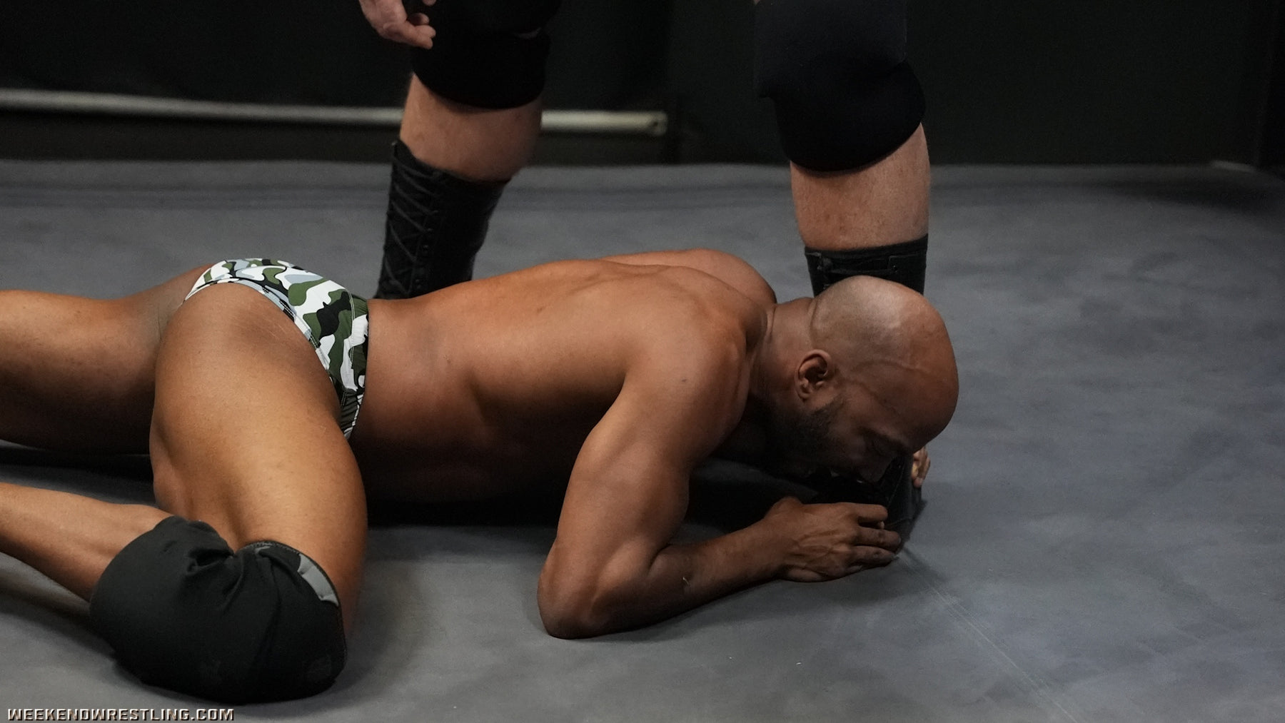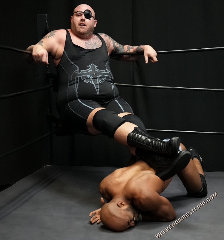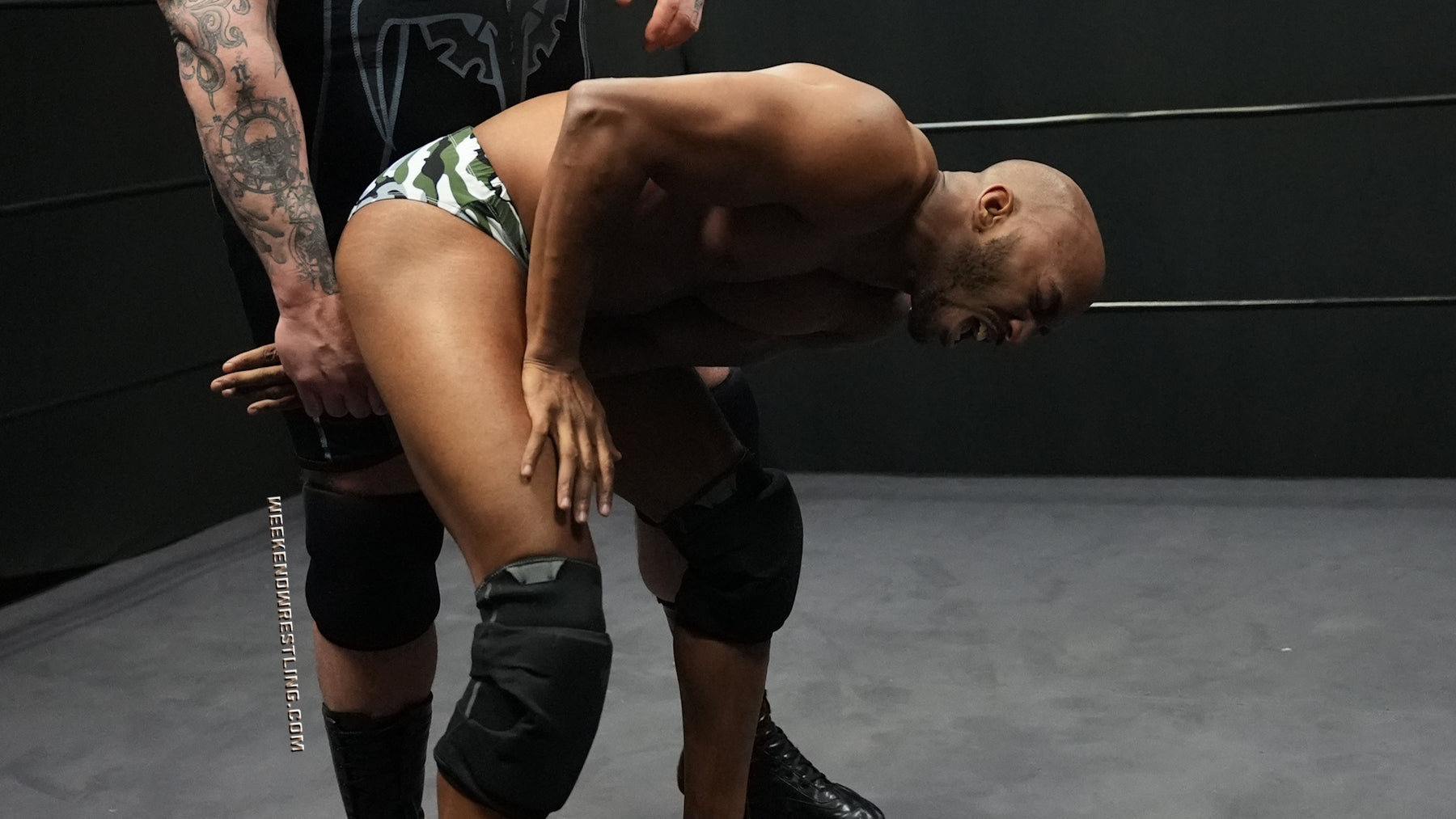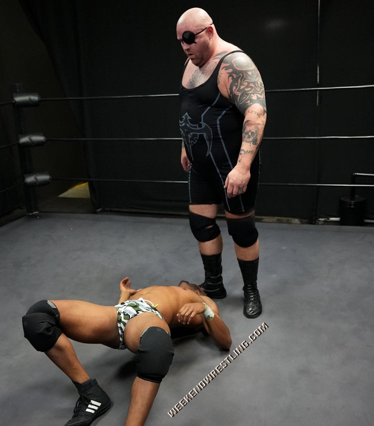 Shockwave takes control from the start, not just dominating but enjoying every second of toying with Tedros. He bends the lean, muscular hunk through crushing holds—bear hugs, over-the-knee backbreakers, Canadian backbreakers, a Gory special, and a deep Boston crab—squeezing and stretching him at will. Even Tedros’ desperate attempts to fight back, including biting, do little to stop the punishment. Shockwave lifts him with ease, even using him as a footstool, smiling all the while as he teases and tortures a man who came in full of confidence but finds himself broken down piece by piece.