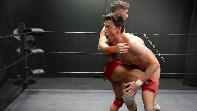 Stefan Stone and Ernie Lofton meet mid-ring, eyeing each other with the kind of smirk that promises a long, heated match. Stefan opens with playful teasing about Ernie’s name, which Ernie shoots right back with charm and wit of his own—setting the stage for a battle of bodies and banter. The early minutes are a tightly matched exchange of headlocks, hammerlocks, and shoulder tackles, with Stefan eventually powering into the lead. He keeps the pressure on with punishing submissions—sleeper holds, surfboards (yes, including a brutal suspended version), and a vicious tarantula that puts every part of Ernie’s impressive frame on display. All the while, Stefan taunts and toys, clearly enjoying every second of the control.