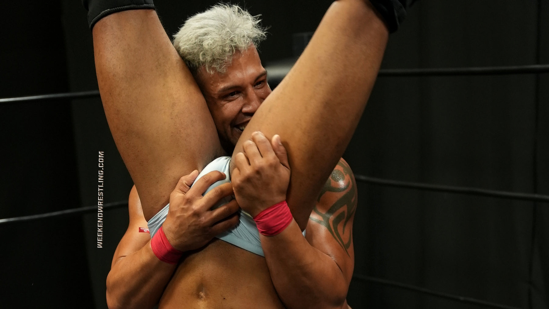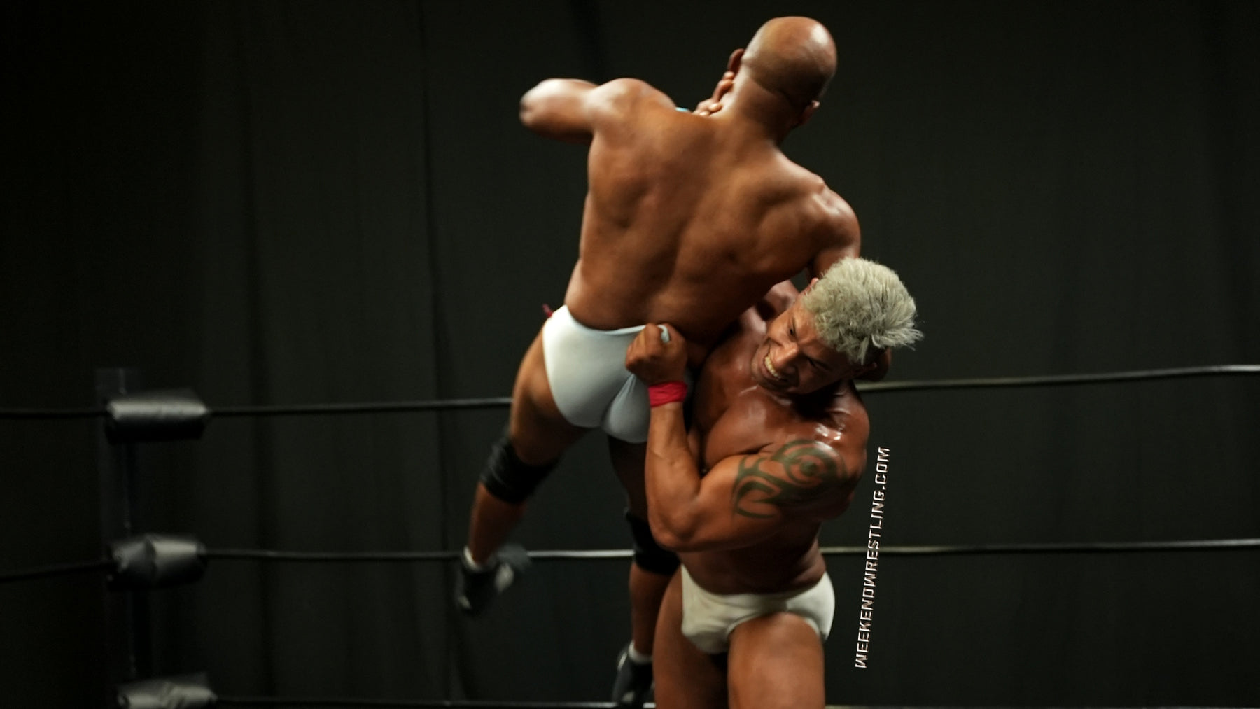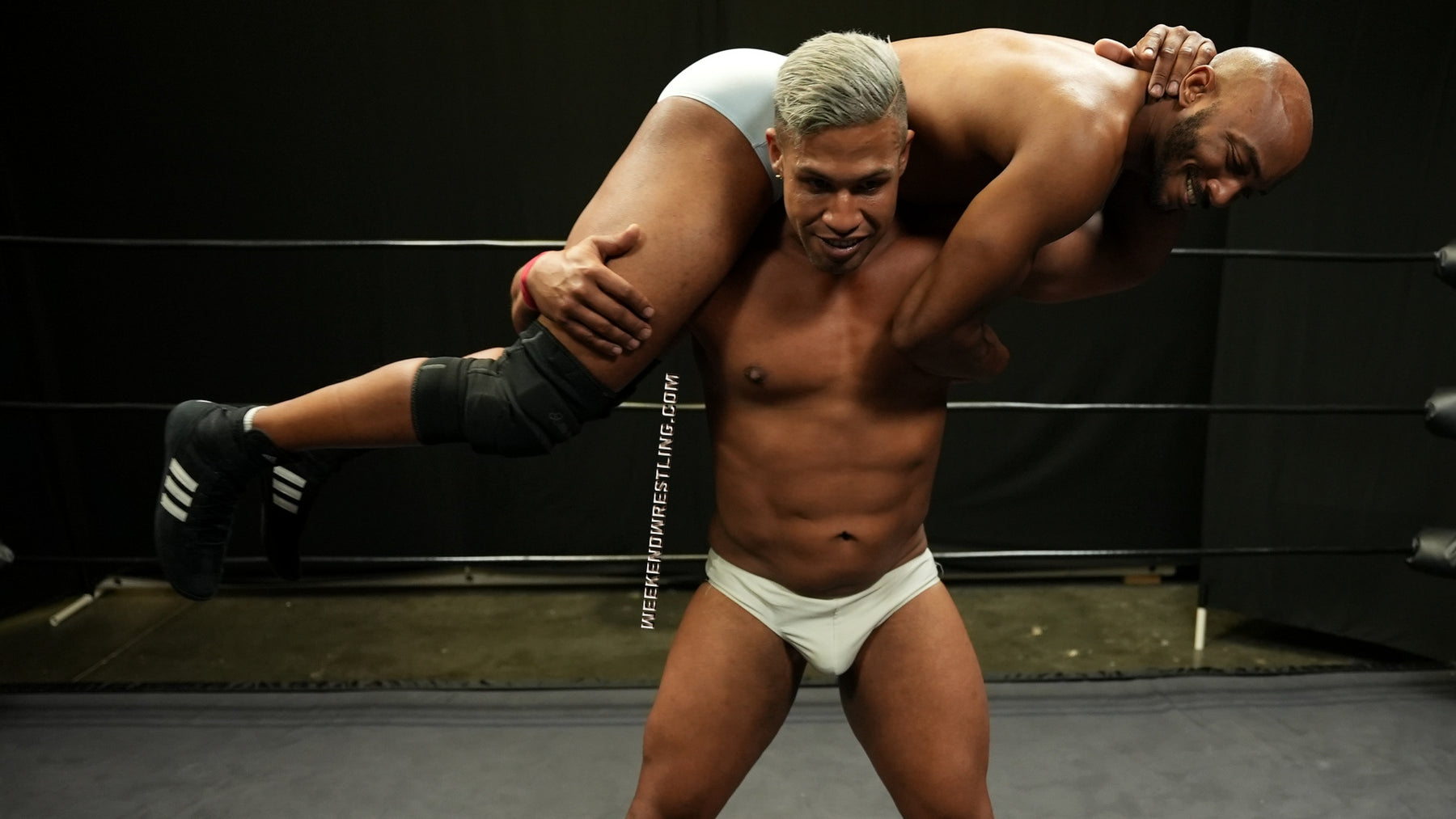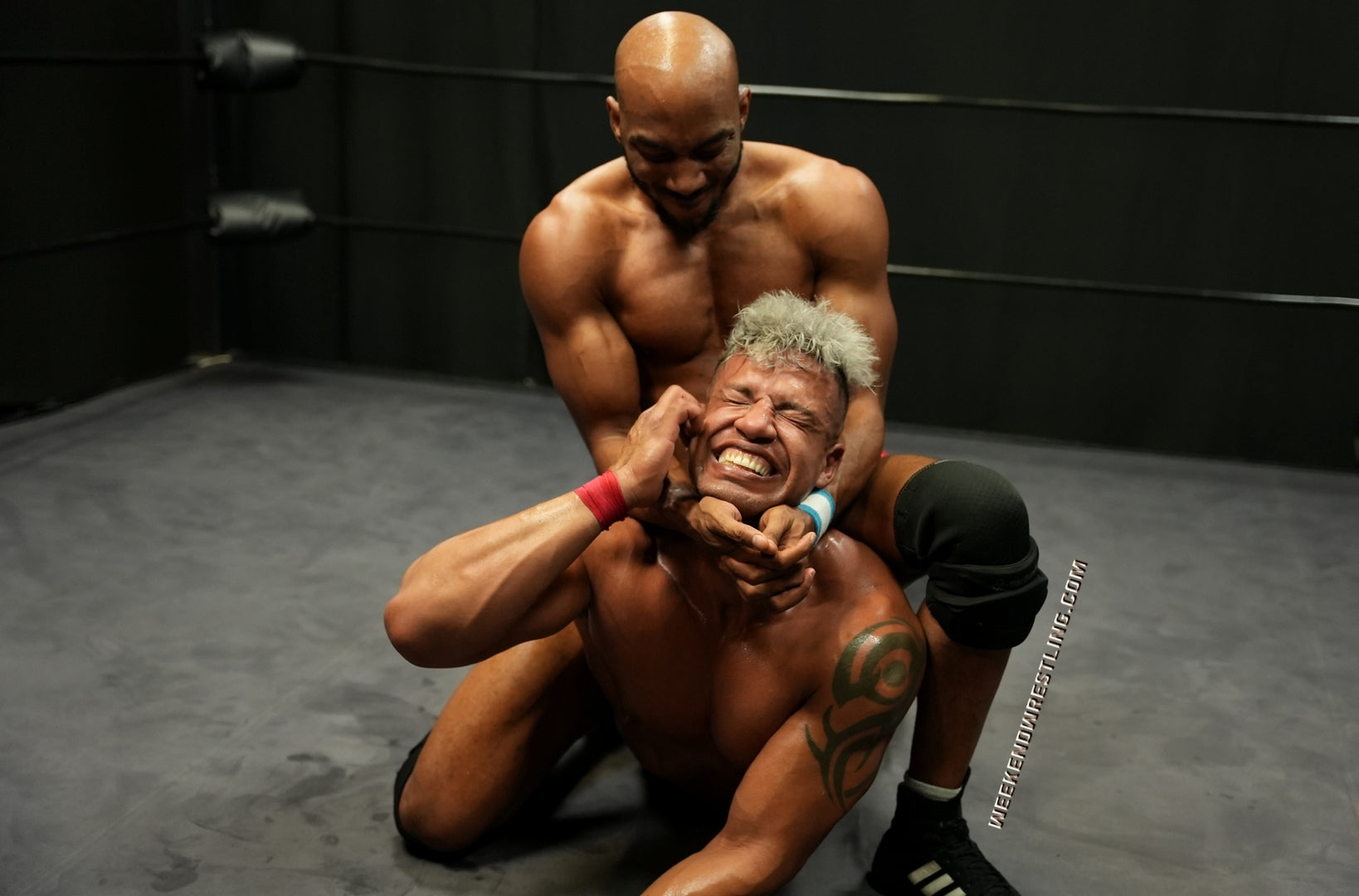 Riding high off his victory over All American Roger Atlas and seeking another win, Tedros, the self-proclaimed "Friendliest Guy at Weekend Wrestling" attempts to irritate and entice Gabe Steel into a match with him.  Things don't go down in the "friendliest" of ways when Gabe targets the manhood of his challenger, causing an opposite and more-than-equal reaction from him.  The two take turns working each other over in some of the most torturous and delicious displays of shredded muscle and dirty tactics that we've seen here at WW.