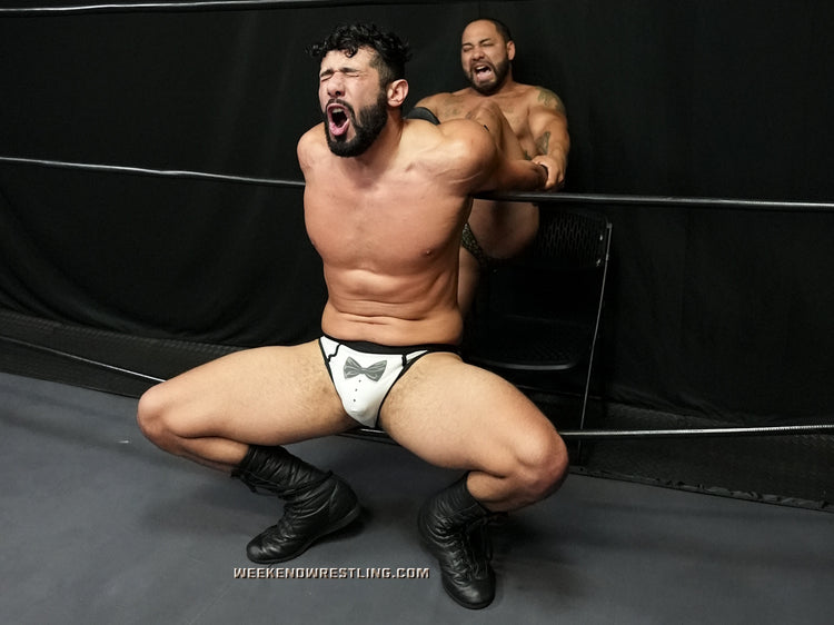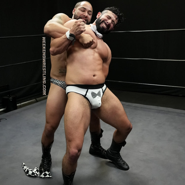 This one’s pure bump-and-grind warfare—muscle on muscle, sweat on skin. THS throws Danny down face-first, spreads him open in a leg lock, and mounts him with intent. But Danny flips it again, humiliating him with a dragon sleeper and a brutal front wedgie, followed by a vicious nipple assault and a claw locked in tight. The Strangler retaliates with an atomic wedgie and a loud, sharp spanking—but he pays for that later. Both studs trade control, racking up close-call pins and letting the cameras get up close and very personal. Danny crushes “the little stranglers” with a boot planted right between the legs, but THS only seems to grow more excited. Chokes, wedgies, purple-nurples, spanking—it’s a masterpiece of domination, seduction, and submission. And when THS sinks in the “Just the Tip,” it nearly finishes things... but Danny’s not giving up the win—or the lesson—so easily. It’s raw, messy, brutally erotic, and absolutely unforgettable.