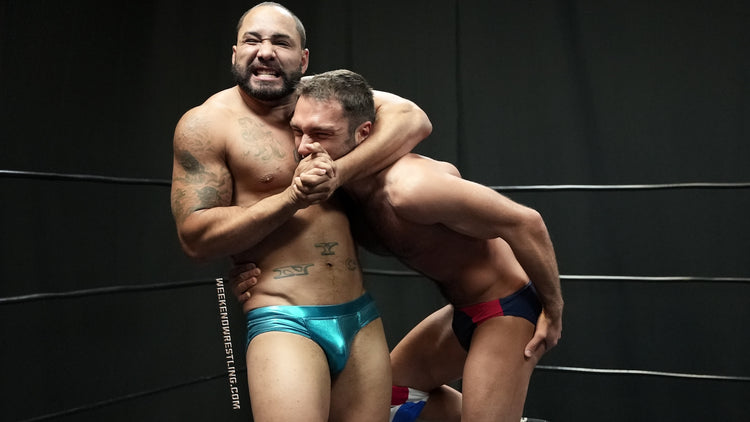 What follows is pure erotic warfare. Danny thrives on humiliation—wedgies, repeated low blows, blatant chokes, stomps, and humiliating roll-up pins with his hand buried in Zach’s trunks. He bends Zach over his knee in a backbreaker, purple nurples him with savage delight, and traps him in suffocating sleepers and scissors. Zach, the veteran, answers with grit and skill—bulldogs, a pair of punishing cross-face chicken wings, a senton, and shoulder blocks that send Danny reeling. Even Zach gets dragged into the game, pulling a revealing pin attempt of his own. Their bodies grind in surfboard stretches, sleepers, and brutal slams, each alpha fighting not just to win but to dominate. Trunks-yanking, moans, sweat, and sheer masculine pride fuel this erotic brawl where only one man leaves with his ego intact.