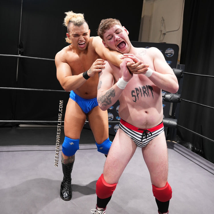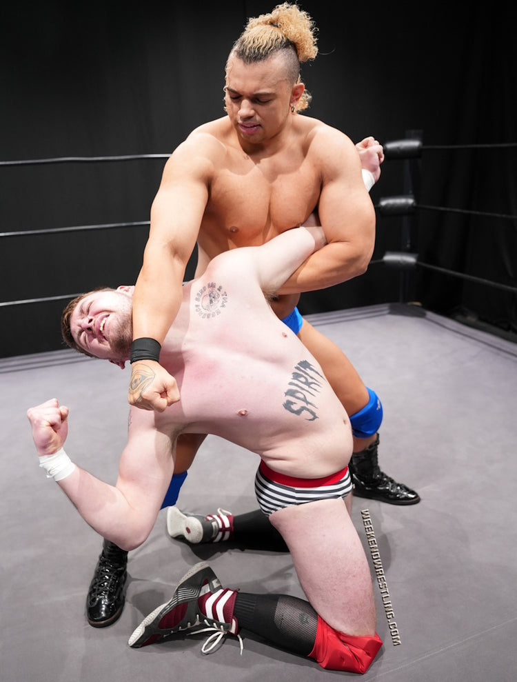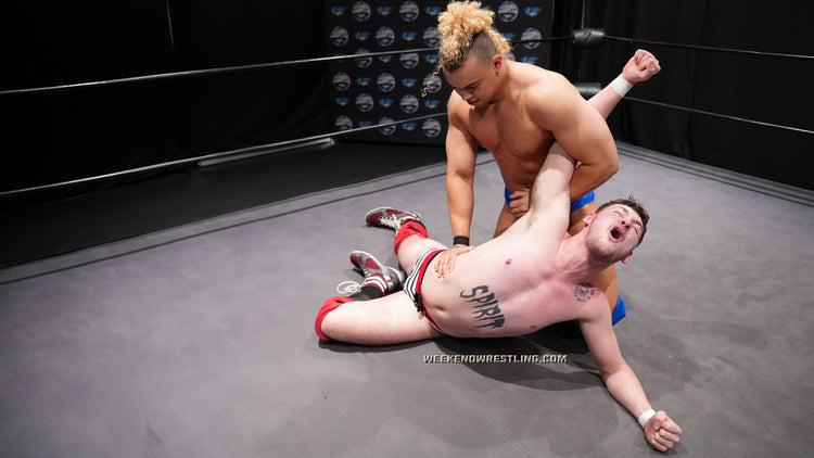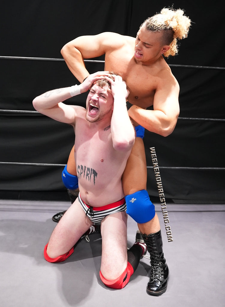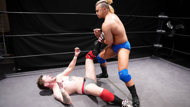 The camera’s eye opens in the Weekend Wrestling ring as Adam Astora storms in after a "17.5-hour" hunt for Tristan Mounts—furious over Tristan allegedly hitting on his girlfriend. It doesn’t take long for everyone except these two hardheaded studs to realize they might be raging over two completely different girls… which only makes the tension dirtier and the aggression meaner. A stiff kick from Adam sets the tone: this is about dominance, control, and making the other man look small. Adam’s baby blue trunks are tenting out with cocky confidence, blue knee pads and black boots framing a hunk who walks like he already owns the room. Tristan is stuffed tight into black-and-white striped briefs with red knee pads and red/gray/white athletic shoes—young, proud, and built like he refuses to be anyone’s victim, even when he’s clearly in over his head.