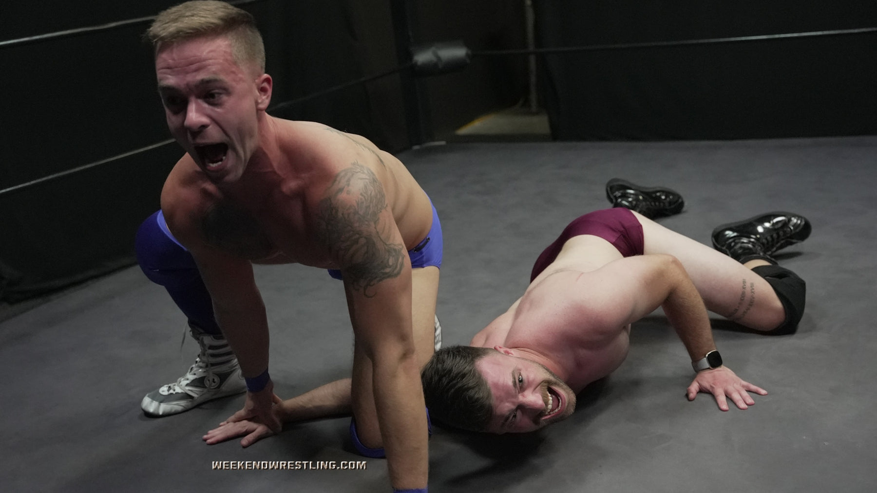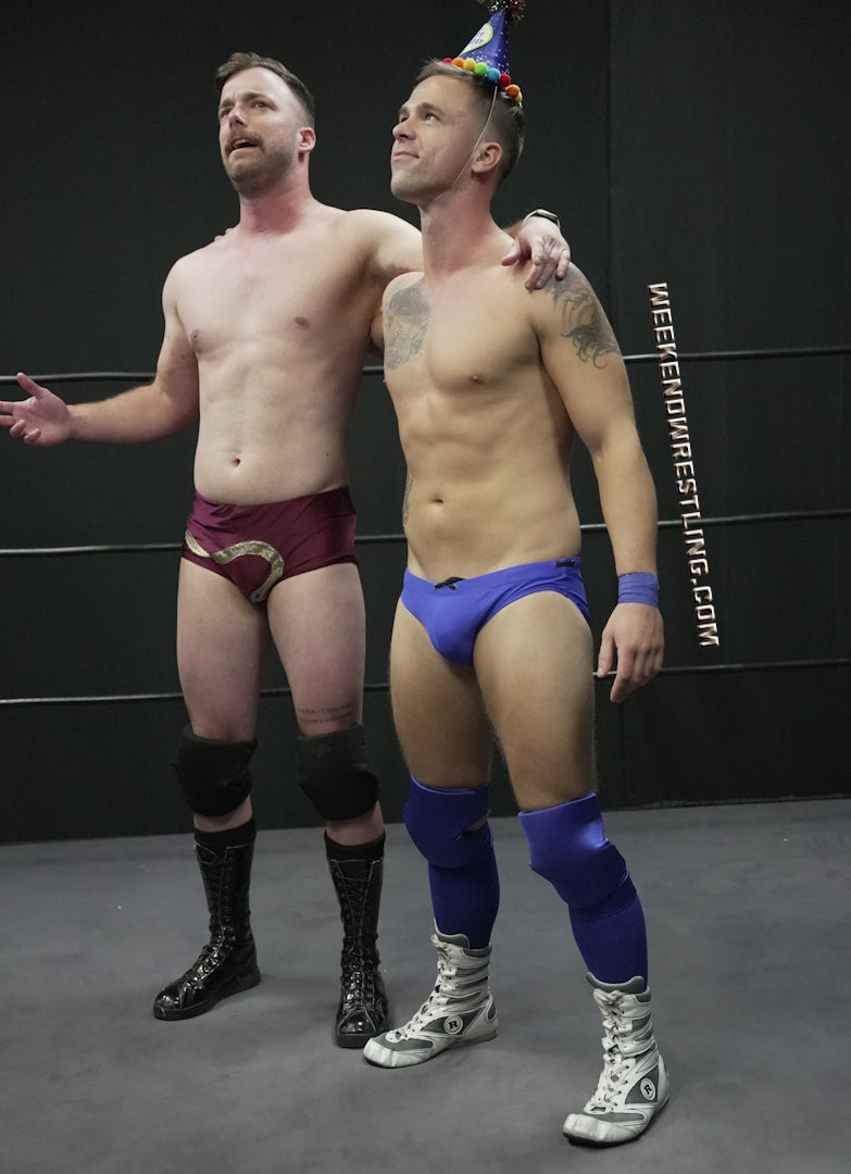 What unfolds is a super hot spectacle of humiliation and submission holds, displaying each other in painful and punishing holds. Austin imposes his authority with over-the-knee spankings and intense holds, making sure Tanner feels the birthday heat. However, Tanner, fueled by a party-hard spirit, retaliates fiercely. Strikes, hardcore submissions, and a bit of payback for the spankings leave Austin stripped out of his trunks.