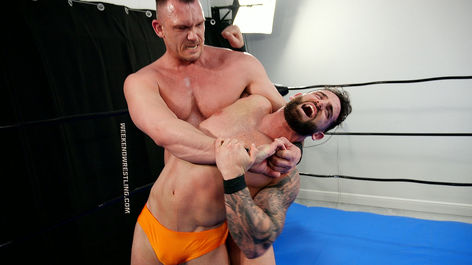 This was a great match up with… current weekend wrestling hunk Zach Reno vs newcomer Blayne… The premise of two twin like hunks going at it in the ring was well done… Both guys look fantastic in this match up ( I am loving Zach thicker hairy build)… This is a match up I highly recommend checking out… As usual Zach Reno never disappoints… He does an amazing job throughout it… Blayne did a great job as well… a nice new addition to weekend wrestling…