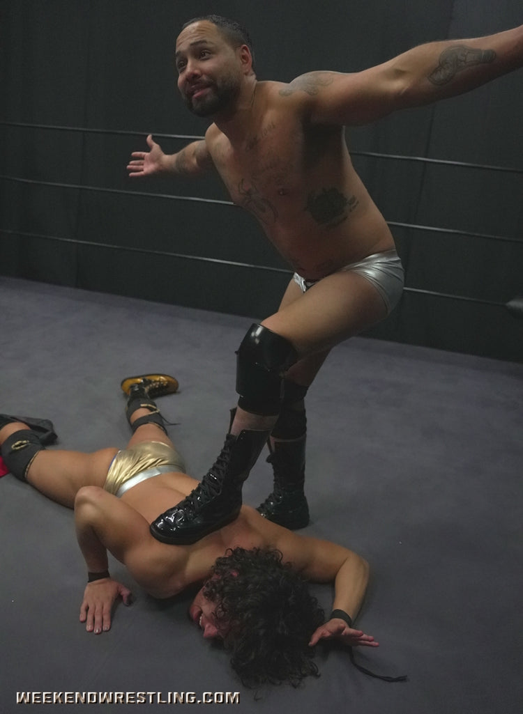 I always love a good Big vs Small match. Ricky Vegas manhandles Stefan and it's so hot. He low blows him, forces him to flex, and knocks him out. Stefan looks hot in the spandex gear and love that he sells the low blows so well clutching his battered bulge throughout the match.